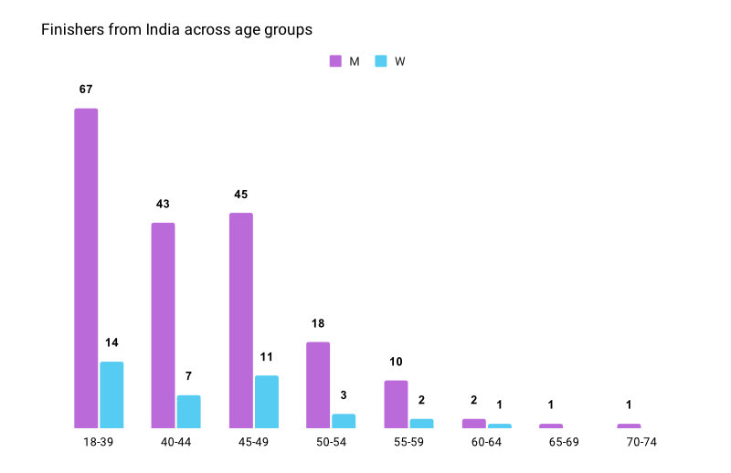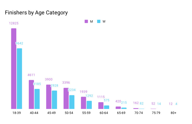 Similar to other World Marathon Majors, age category classification is only for 40 years and above. So 18-40 years is the open category, and then the age categories start with 5 year increments. On the other hand in India, we typically see age category classification starts from 25 (18-25, 25-30, etc.,). So, as one might expect, at London marathon the 18-40 age group has the highest number of finishers, and the numbers gradually decrease as the age increase.