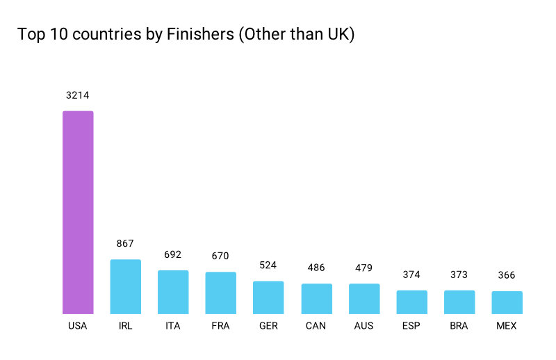 There are finishers from 148 countries in total, representing all the continents and various pacific islands. If we exclude the UK (host country), we can see that the majority of finishers come from countries in North America, Europe, South America, and Australia. USA has the highest number of finishers with 3217.