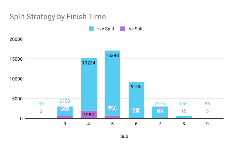 7.4% of the finishers employed a negative split strategy, which means they ran the second half of the race faster than the first. This is higher than the 4% of finishers who employed a negative split strategy in the TMM 2023. It’s interesting to note that most of the negative split finishers at the London Marathon completed the race under four hours.