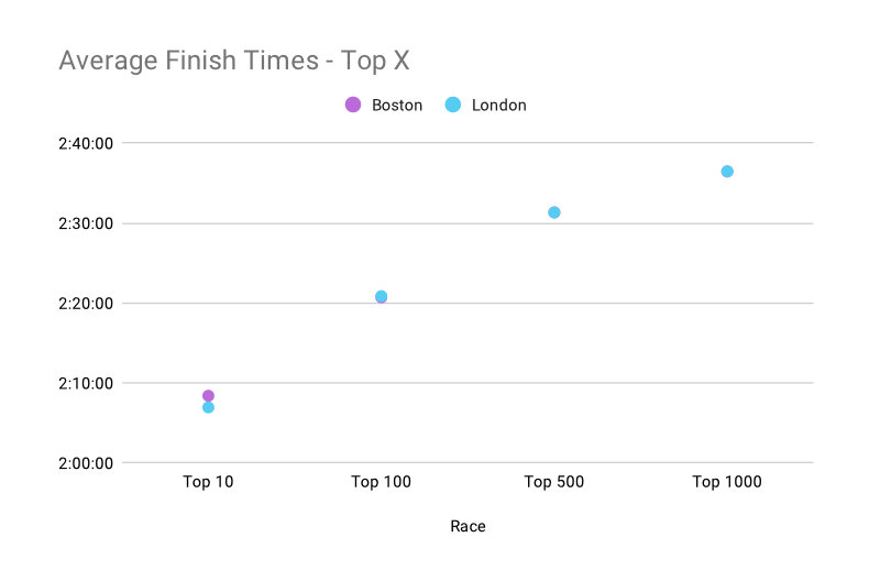 Boston and London are two difference courses. It is well known that Boston’s course is much harder due to its rolling nature. But we want to see what could be the effect of the course difficulty on finish times. We did look at the average finish times of Top 10,100,500 and 1000 finishers.