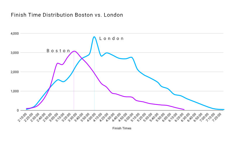 - London marathon is way bigger with 48,000 finishers, compared to 27,000 finishers.