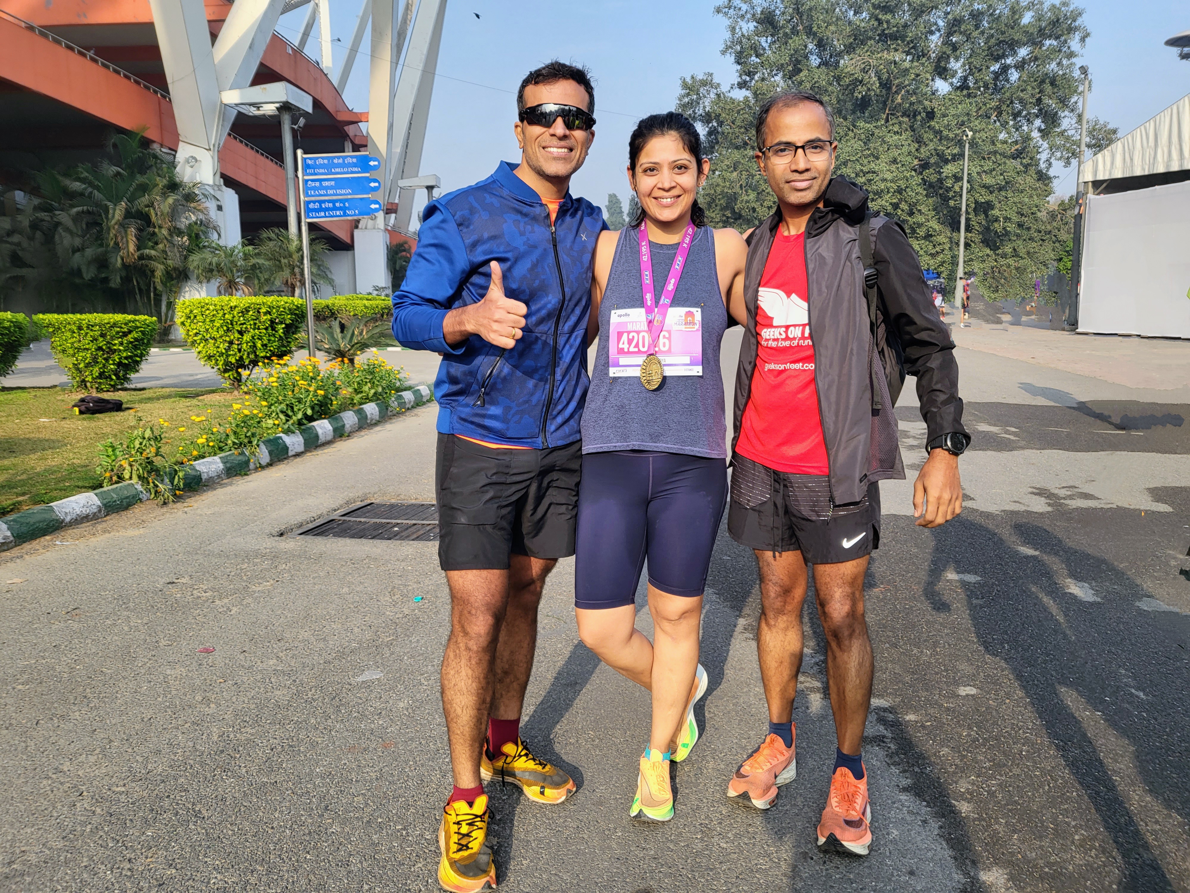 I shared the cab with 2 of my team members (they both BQ’ed) and reached JNL stadium by 3:30 am. We had enough time to keep our bags, warm up, go for multiple loo breaks and socialize with fellow runners from across India.