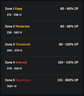 CP is used to determine your power zones. Power zones are different power ranges that provide guidance when training with power. Power zones give you a general idea of what type of training falls within a power range. In my experience of training with power, you run within a (much-smaller) sub-range of a particular zone rather than dialing into a specific wattage number in that power zone. Fig-2 shows my power zones as calculated by Stryd basis my CP of 270 w.