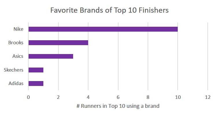 - The most popular brand among the Top 10 runners is Nike, followed by Brooks and Asics.