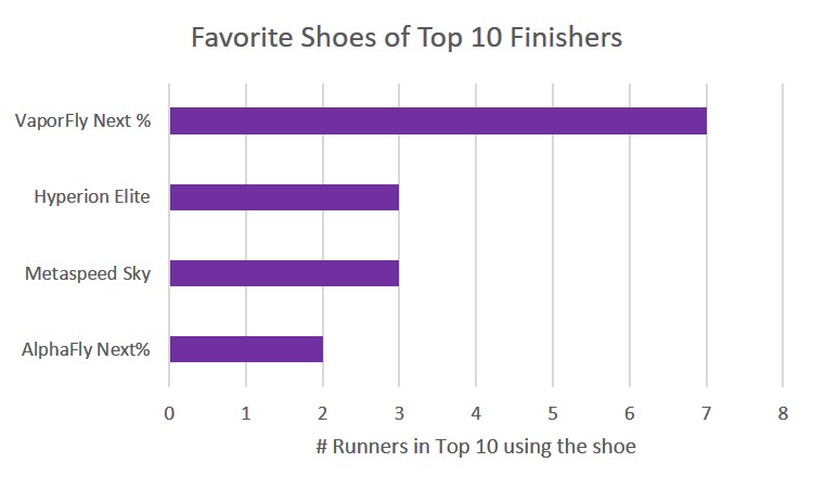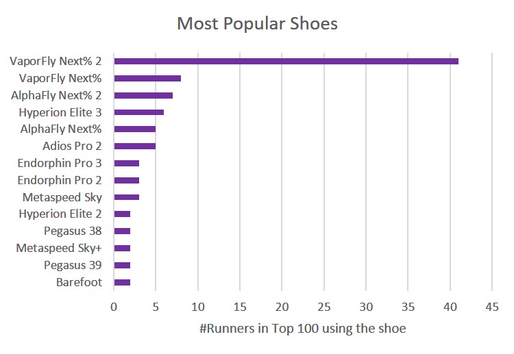 - Nike VaporFly Next% and Next% 2 are the favorites for the top 100. 31 of the top 100 are using these two shoes.