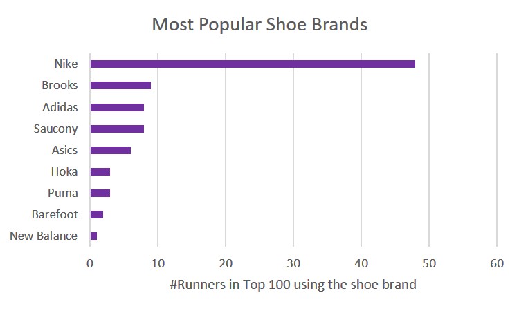 - Nike is the most popular shoe brand (48 runners) with roughly half the top 100 runners using it.