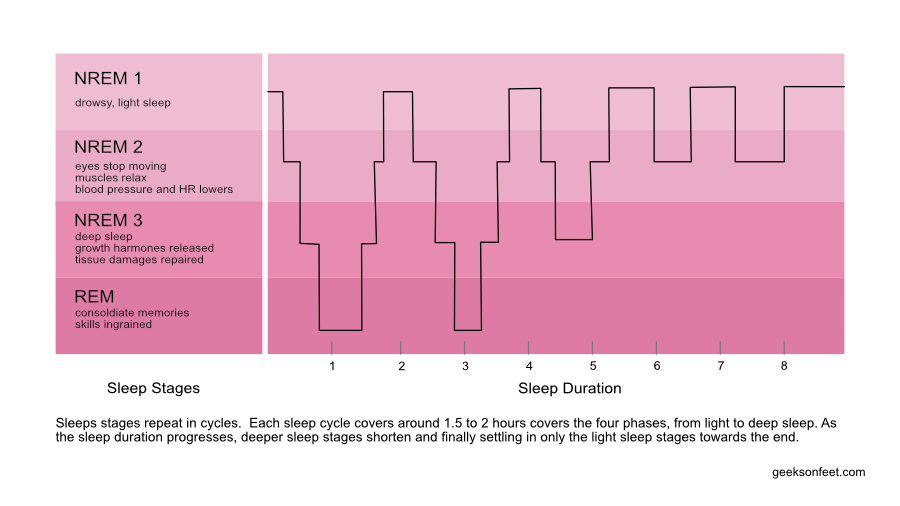 - Stage IV - REM: Often coming 70 to 90 minutes into the cycle. We consolidate memories and ingrain skills, which are obviously important for our athletic performance. Training that involves motor/cognitive skills, this phase of sleep is crucial.