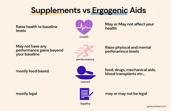 | Supplements can be used when the body is deficient in certain nutrients and obtaining the nutrients from food is not viable. | Ergogenic aids raise your performance without any consideration of your nutritional deficiencies. |