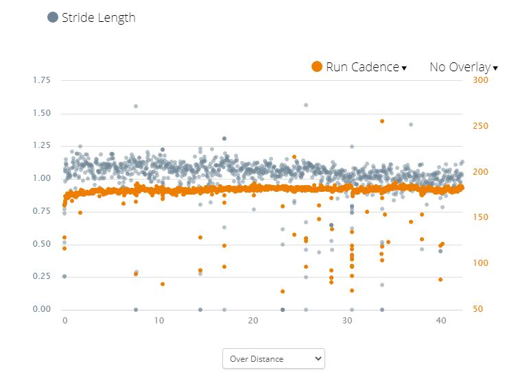I now have lot of interesting data to analyze and get insights from. My stride length had dropped significantly after the 29th kilometer, and an associated drop in pace too. I think this drop is to do with my glutes not able to endure the distance. An area definitely to work on.