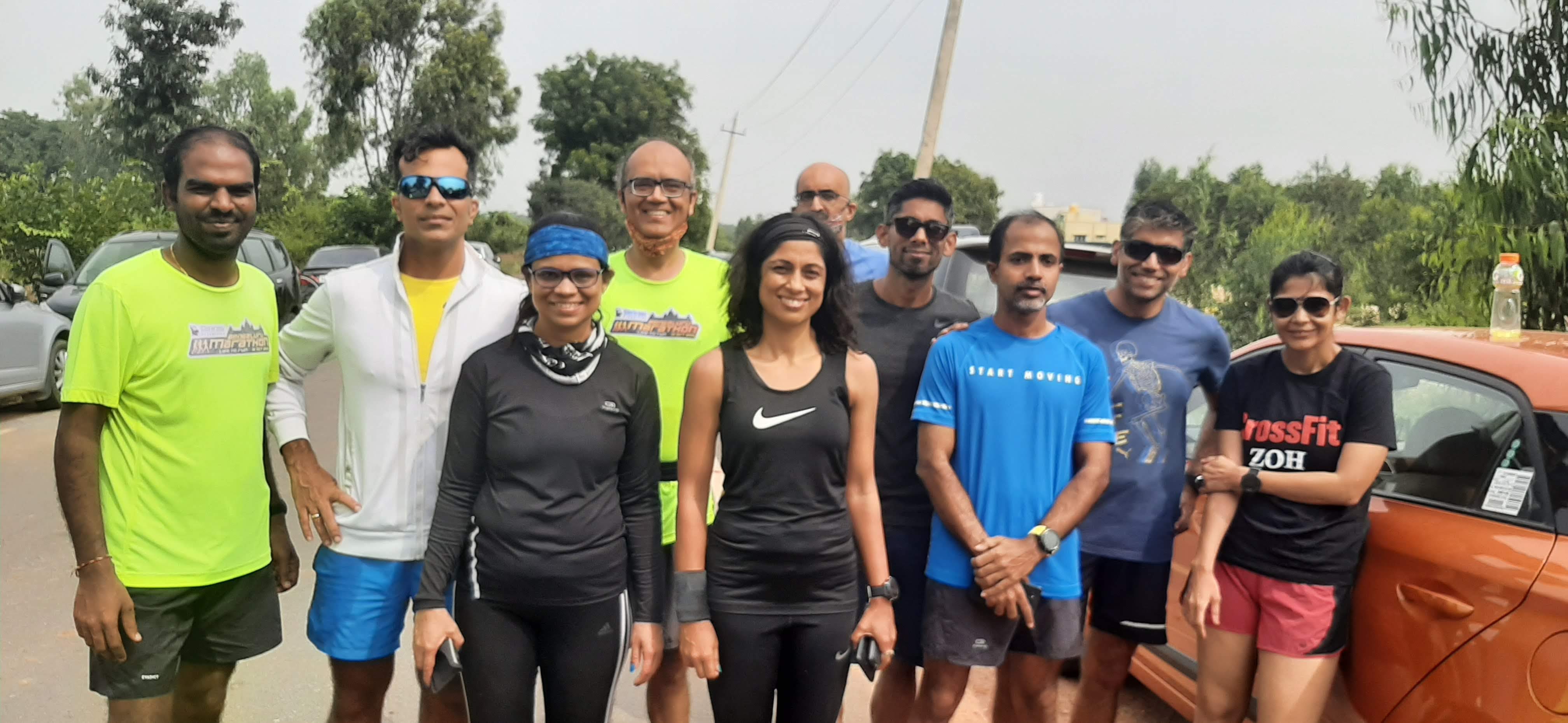 Thus we continued with our training. At the end of our second cycle, we ran a half marathon time trial to check on our progress. We picked a route on the outskirts of Bangalore keeping social distancing in mind. During the run, we had assigned a few hydration points and parked our cars there, with water bottles.