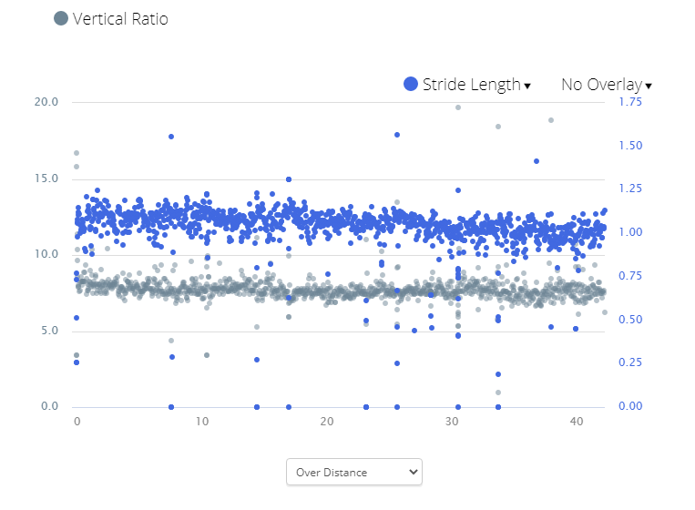 Correlation of vertical ratio and stride length confirms the above observation about my glutes not able to endure.