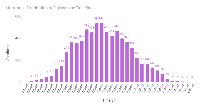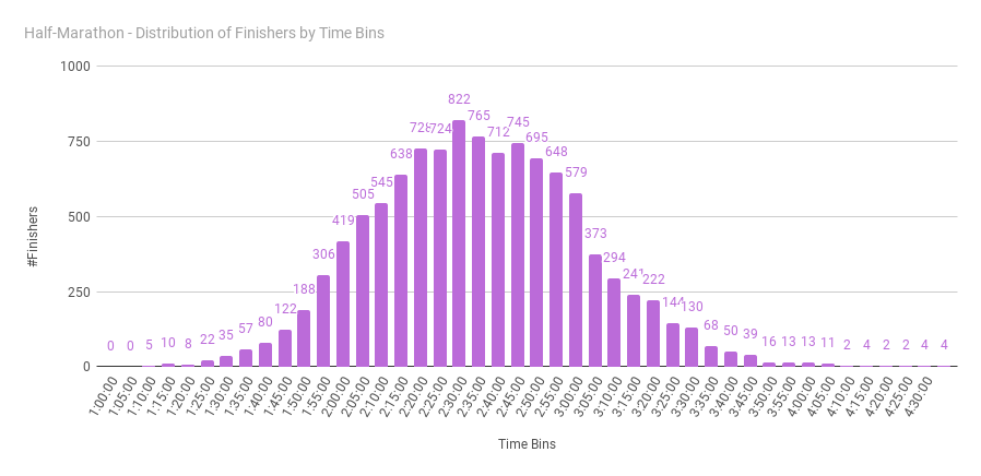 We have taken 5-minute slices of finish times for half-marathon, and it is between 2h:25m and 2h:30m where most runners (822) have finished. As with most data, the distribution indeed follows a nice bell curve with a long head and a tail.