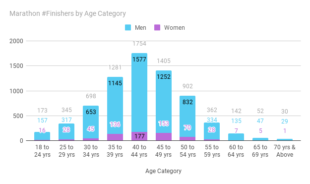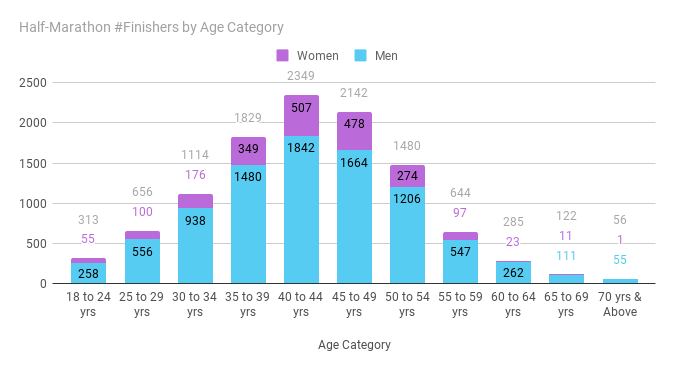 Women finishers in both marathon and half-marathon have slightly improved this year from the last event with 9% of total finishers in Marathon, and about 19% of finishers in half-marathon are women.