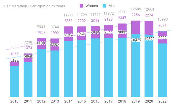 The half-marathon distance participation has been steady over the years. That is largely because of the organizers restrictions on the entry due to limited space. Change in the route, and the new start-point, probably made this year one of the lowest in the last 10 years. A total of 10,993 finished the half-marathon distance, roughly 13% drop from the previous edition.