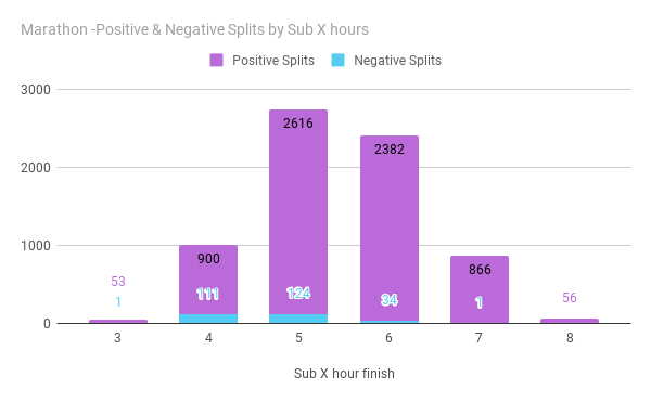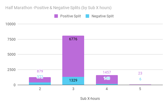 Half-marathon finishers have much better negative splits. 17% of have finished with negative splits. 30% of those finished under 2 hours had negative splits.