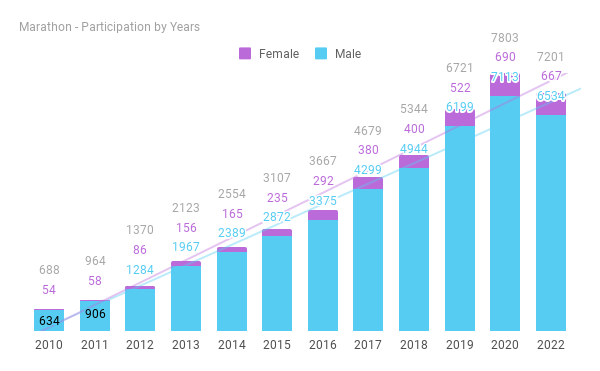 The marathon distance participation has been growing over the years, with about 16% growth in finishers from 2019 to 2020.Despite the event happening after 3 years, and all the hype around it, the marathon event saw a dip in the finisher numbers this year. There were 7201 finishers, with a 7% drop compared to the 2020.