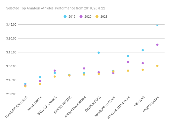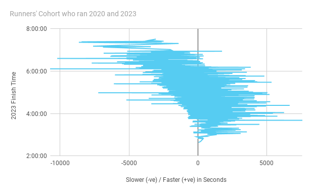 There were about 1400 runners that ran all the 3 recent editions. We’ve tracked their progress across the three editions. Interestingly, the majority of the slower runners got further slower from their earlier timings, while the faster runners got much faster. 80% of the runners who ran under 4 hours in this edition, have improved their timing from the 2020 edition. Only 30% of the runners who ran above 5 hours have improved their timing from the 2020 edition, and the remaining failed to improve.