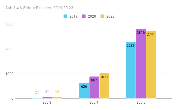 We’ve looked at the average marathon finish time of Top 10, 50, 100, 500, 1000 runners over the last 3 years. Interestingly the finish times are consistently improving. Average for Top 10 is an impressive 2h:33m compared to 2h:43m over 5 years ago.