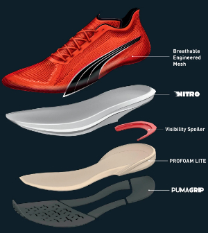 Velocity Nitro, as the name suggests uses Nitro foam for the midsole. The midsole is made up of two layers of foam, the top layer is the Nitro foam (nitrogen-infused EVA foam), and there is a thin second layer made up of ProfoamLite foam(also an EVA based foam but is more firm). ProfoamLite was introduced last year with Puma’s UltraRide shoe. The outsole uses new PUMAGRIP rubber.