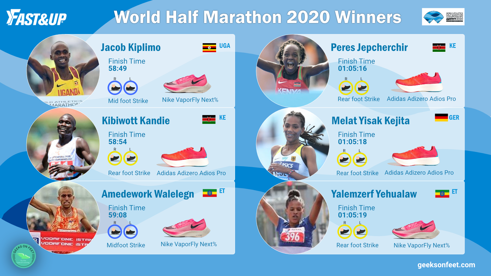 World Half Marathon 2020 Winners Shoes, and Foot Strike of World Athletic Half Marathon Championship Winners October 18, 2020 Team GeeksOnFeet 0 minutes read Twitter Facebook Whatsapp