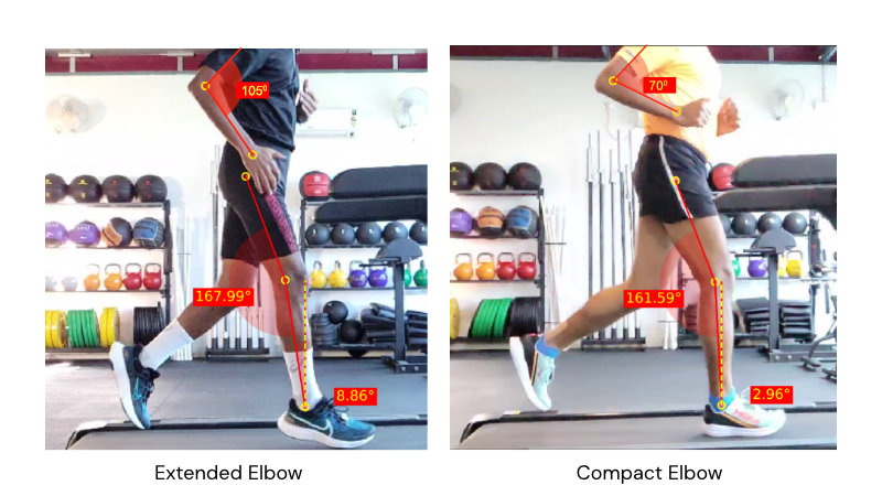 In our studio, we observed runners with different angles of bend at the elbow. We see runners with elbows extended (elbow angle far more than 90 degrees), and we also see runners with compact elbow angles (below 90 degrees). The picture below shows two runners one with an extended elbow (105 degrees), and the other with a compact elbow (70 degrees).