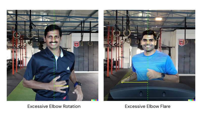 - Excessive Front to Back movement of the elbow, often indicates high knee flexion and/or excessive kickback. Such form is typical of sprinters, and short-distance runners. However, it is not economical for long-distance runners.