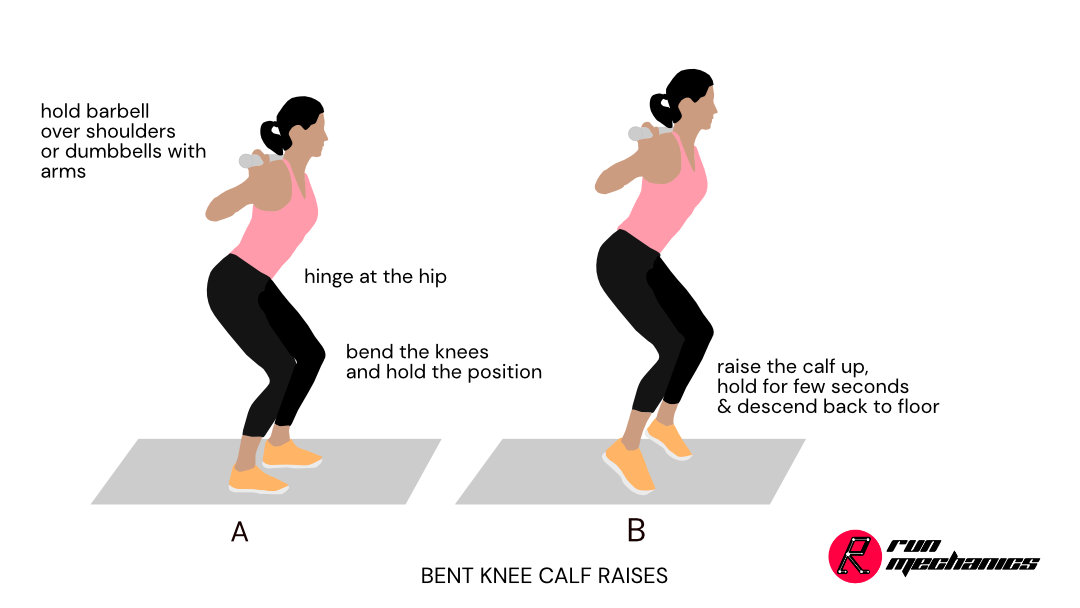 Calf Raises helps runners in multiple ways. At a basic level, it helps strengthen calf muscles, that includes posterior tibialis. The posterior Tibialis plays an essential role in controlling the foot arch, hence calf-raises are a good drill to build a strong foot arch and control pronation and foot stability. The second variation includes heel-drop also helps in stretching the calf, ankle & plantar, and adds further difficulty to Calf Raises.