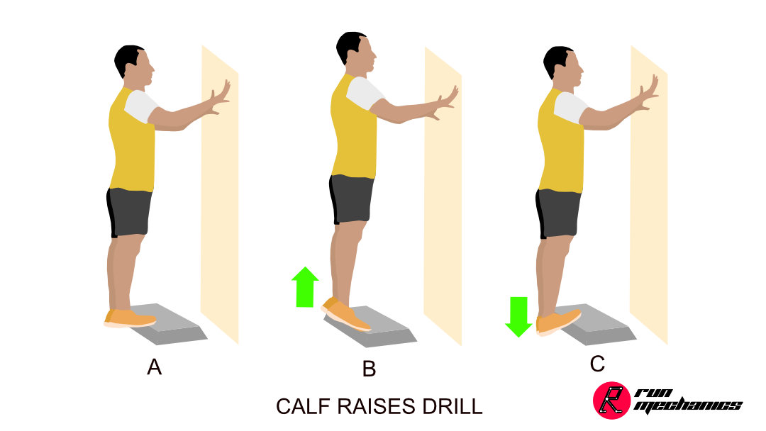 - In the calf-raises drill (first variation), hold the heel position once you reach the horizontal position as shown in figure A