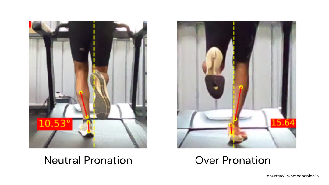 As the foot touches the ground when we land, the foot lands on the outside and loosens up at mid-stance as the foot touches the ground fully and stabilizes itself. This process is called ‘pronation’ and happens with every runner. However, for runners with weak foot core or foot arches, eversion angles are higher than normal, which is called over pronation.