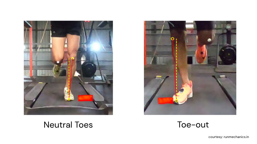As you can see in the second frame in the picture below, the right foot has excessive tow-out is turned outwards. The first frame on the left is neutral and shows no toe out.