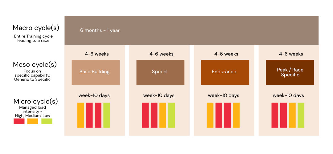 Based on the type of distance training for, and current fitness levels, one has to bring in the right training stimulus and work on specific areas of improvement. More importantly, in order to see effective training gains, rest & recovery also has to be baked into training. In order to reach the peak performance, training has to be planned over many years to gain the necessary physiological and biomechanical abilities to reach the performance goals. Here is where periodization comes into play.