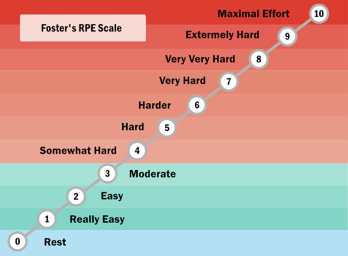 One of the popular RPE scales is Forster’s RPE scale. It is a simple scale of 0-10, and we rate our perceived effort using the cues provided on the scale.