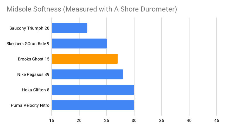 The midsole is where the Ghost 15 sees a significant update. It features a full length DNA LOFT V2 cushion foam, which Brooks says is more softer and lighter than its predecessor. DNA LOFT is proprietary cushioning foam which is made up of a combination of EVA foam, rubber, and infused with nitrogen gas. We measured the durometer of both editions in our lab, and can confirm that Brook’s claim of softer midsole is true.