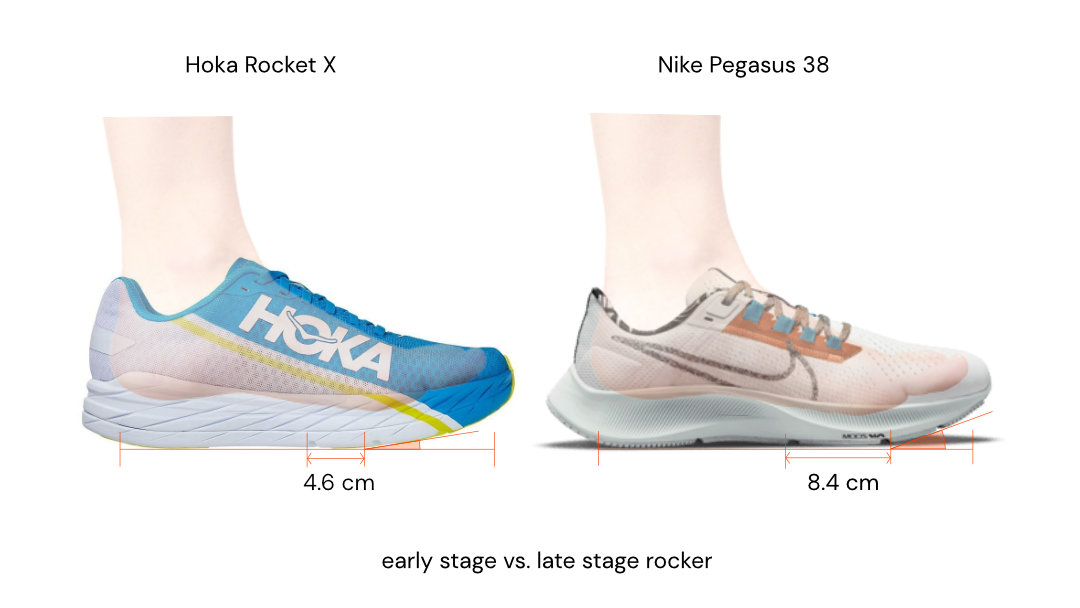 The picture below shows the midsoles of Hoka Rocket X, and Nike Pegasus 38. As you can see the midsole starts rising up roughly about 4.6cm from the center of the shoe (for a shoe length of 30cm). However, the rocker in Pegasus 38 is much farther from the center of the shoe (8.4cm). So it engages much later in the gait cycle when compared to Rocket X.