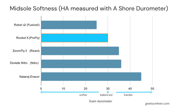 The midsole foam is very well balanced in terms of softness. To get a view of the softness of the midsole, we have measured the softness of multiple shoes. it is softer than other carbon plated shoes like Nike ZoomFly 3 (React foam) and Puma Deviate Nitro (Nitro foam), while firmer than New Balance Rebel V2 (Fuelcell foam).
