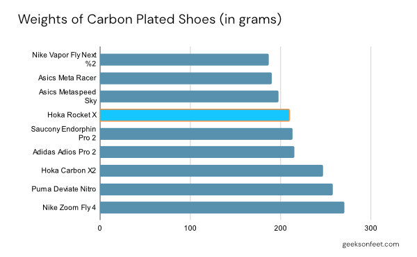 Published shoe weight is 210g (at UK 8), which is what makes it ideal for racing. We have measured the weight UK 10 at 217g. When compared to other carbon plated shoes in the Indian market, it is one of the lowest next only to VaporFly and Metaspeed Sky. In the sub 15k INR price range, it is the cheapest shoe.