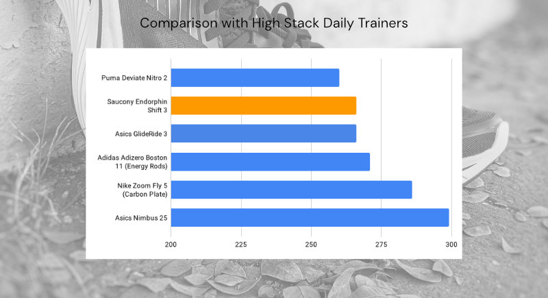 This is a maximal shoe, as I mentioned earlier. Shift 3 looks huge and one would expect it to be on the heavier side. The Shift 3 has a stack height of 39mm in the heel, pretty close to breaking the World Athletics legal limit of 40mm for road racers, but we are living in times where brands are not reluctant to push even higher (Hello Asics Superblast!). Shift has 35mm height in the forefoot, resulting in an offset of 4mm, making it most suited to forefoot and midfoot runners. But the heel bevel helps heel strikers too. Despite the stack height, Shift 3 is surprisingly light for the stack, weighing 266 grams for UK 8. It is much lighter compared to its previous editions, and it also matches up to the other high-stacked daily trainers in the competition.